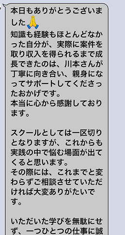 毎日満員電車に揺られ、会社では上司の顔色を伺う日々。。「俺の人生、このままでいいのか?」という閉塞感と、会社に依存する怖さを感じていました。独立を視野に入れたスキルが欲しいと思い、この講座に参加。最初は「本当に自分なんかにできるか?」と半信半疑でしたが、企業の本格的なノウハウを学べたおかげで、自信がつきました。